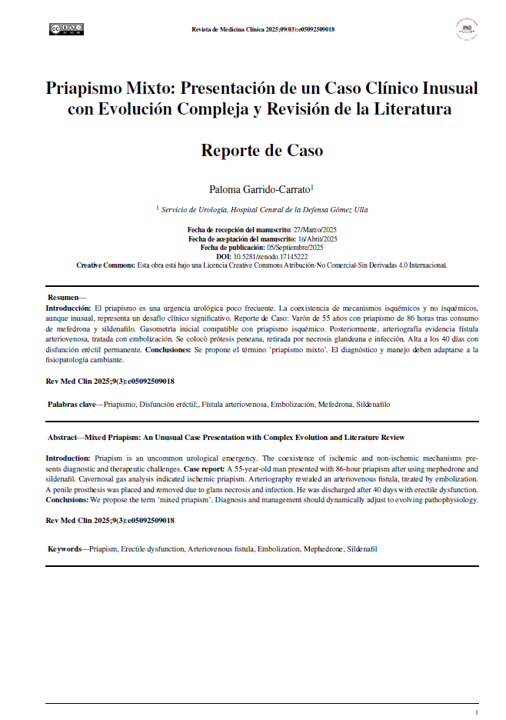 Introducción: El priapismo es una urgencia urológica poco frecuente que puede conducir a disfunción eréctil permanente si no se trata de forma oportuna. Se clasifica clásicamente en isquémico (bajo flujo) y no isquémico (alto flujo). Sin embargo, la coexistencia de ambos mecanismos —aunque extremadamente rara— representa un desafío diagnóstico y terapéutico significativo. Reporte de caso: Presentamos el caso de un varón de 55 años con una erección persistente y dolorosa de 86 horas de duración tras el uso recreativo de mefedrona y sildenafilo. La gasometría cavernosa inicial indicaba un priapismo isquémico, tratado sin éxito mediante aspiración e irrigación. Una arteriografía posterior reveló una fístula arteriovenosa cavernosa, confirmando un componente arterial adicional. Se realizó embolización selectiva. Ante la persistencia del dolor, se implantó una prótesis peneana, que debió ser retirada por complicaciones infecciosas y necrosis del glande. El paciente fue dado de alta tras 40 días, con importantes secuelas funcionales y estéticas. Conclusiones: Este caso representa una entidad clínica no descrita sistemáticamente en la literatura: el “priapismo mixto”, definido por la coexistencia simultánea de mecanismos isquémicos y no isquémicos. Se enfatiza la necesidad de un enfoque diagnóstico dinámico y un tratamiento escalonado, especialmente en presencia de sustancias vasoactivas recreativas.