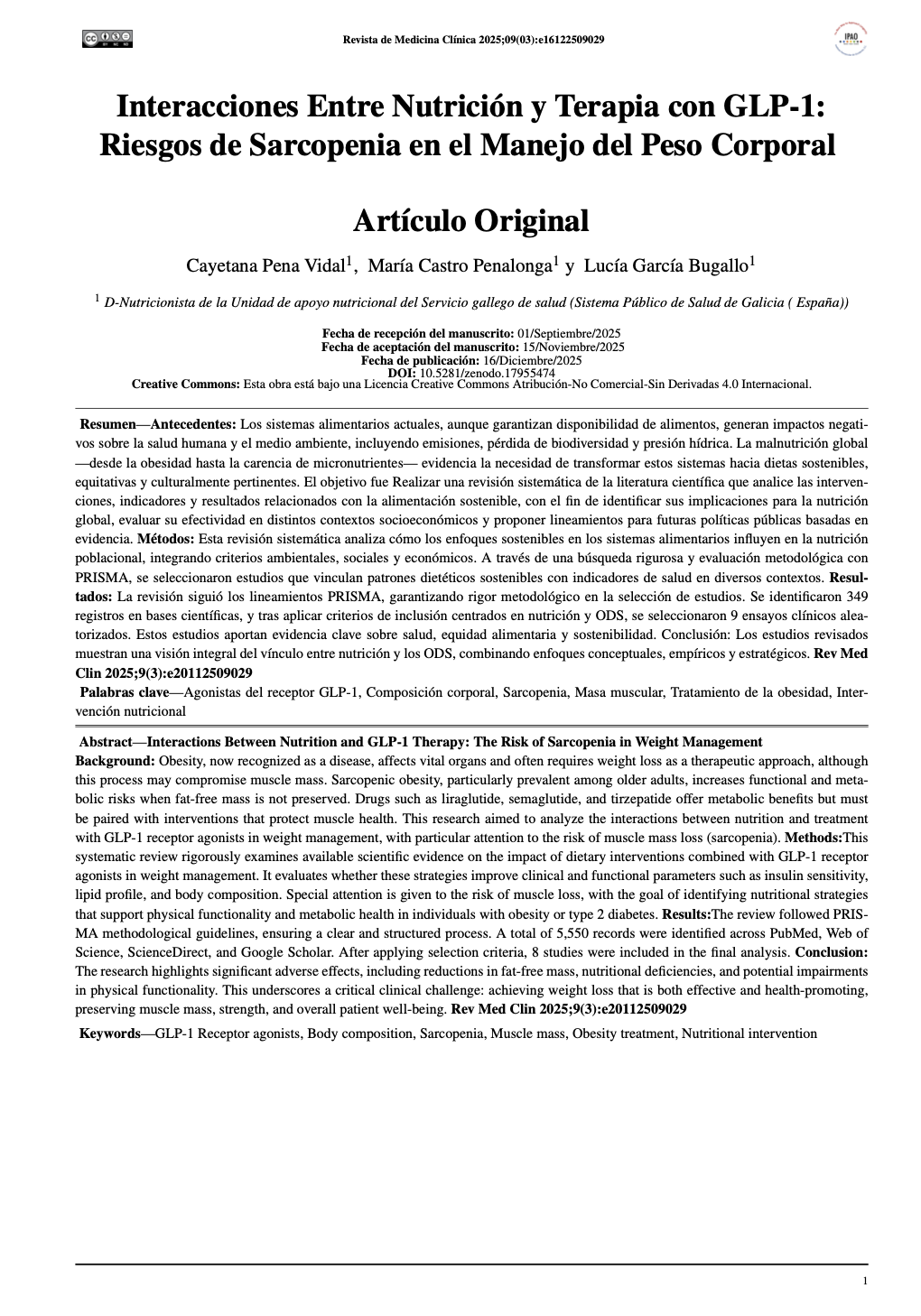 Interacciones entre Nutrición y Terapia con GLP-1: Riesgos de Sarcopenia en el Manejo del Peso corporal. Rev Med Clin [Internet]. 2025 Dec. 16 [cited 2026 Feb. 4];9(3):e16122509029. Available from: https://ictuslatam.medicinaclinica.org/index.php/rmc/article/view/697