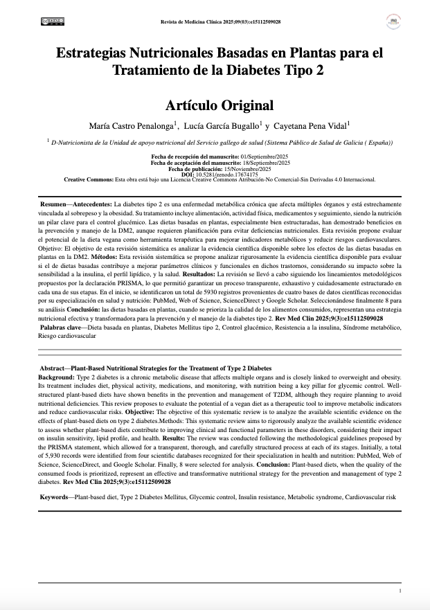 Antecedentes: La diabetes tipo 2 es una enfermedad metabólica que afecta múltiples órganos y está vinculada al sobrepeso/obesidad. Su tratamiento incluye alimentación, actividad física, medicamentos y seguimiento, siendo la nutrición un pilar para el control glucémico. Las dietas basadas en plantas bien estructuradas, han demostrado beneficios en la prevención y manejo de la DM2, aunque requieren planificación para evitar deficiencias nutricionales. Esta revisión propone evaluar el potencial de la dieta vegana como herramienta terapéutica para mejorar indicadores metabólicos y reducir riesgos cardiovasculares. Objetivo: El objetivo de esta revisión sistemática es analizar la evidencia disponible sobre los efectos de las dietas basadas en plantas en la DM2. Métodos: Esta revisión sistemática se propone analizar rigurosamente la evidencia científica disponible para evaluar si el de dietas basadas contribuye a mejorar parámetros clínicos y funcionales en dichos trastornos, considerando su impacto sobre la sensibilidad a la insulina, el perfil lipídico, y la salud. Resultados: La revisión se llevó a cabo siguiendo los lineamientos metodológicos propuestos por la declaración PRISMA, lo que permitió garantizar un proceso transparente, exhaustivo y cuidadosamente estructurado en cada una de sus etapas. En el inicio, se identificaron un total de 5930 registros provenientes de cuatro bases de datos científicas reconocidas por su especialización en salud y nutrición: PubMed, Web of Science, ScienceDirect y Google Scholar. Seleccionándose finalmente 8 para su análisis. Conclusión: las dietas basadas en plantas, cuando se prioriza la calidad de los alimentos consumidos, representan una estrategia nutricional efectiva y transformadora para la prevención y el manejo de la diabetes tipo 2.